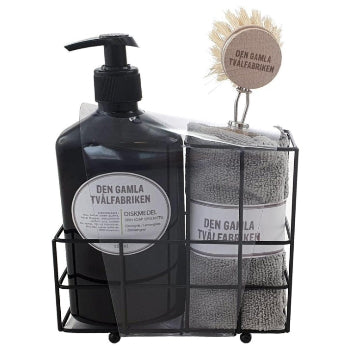 Snyggt och praktiskt diskset, går med fördel att ha framme på diskbänken. Hållare i svart metall med diskborste, microduk samt diskmedel. En uppskattad gåva.