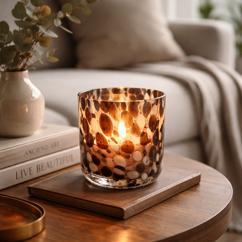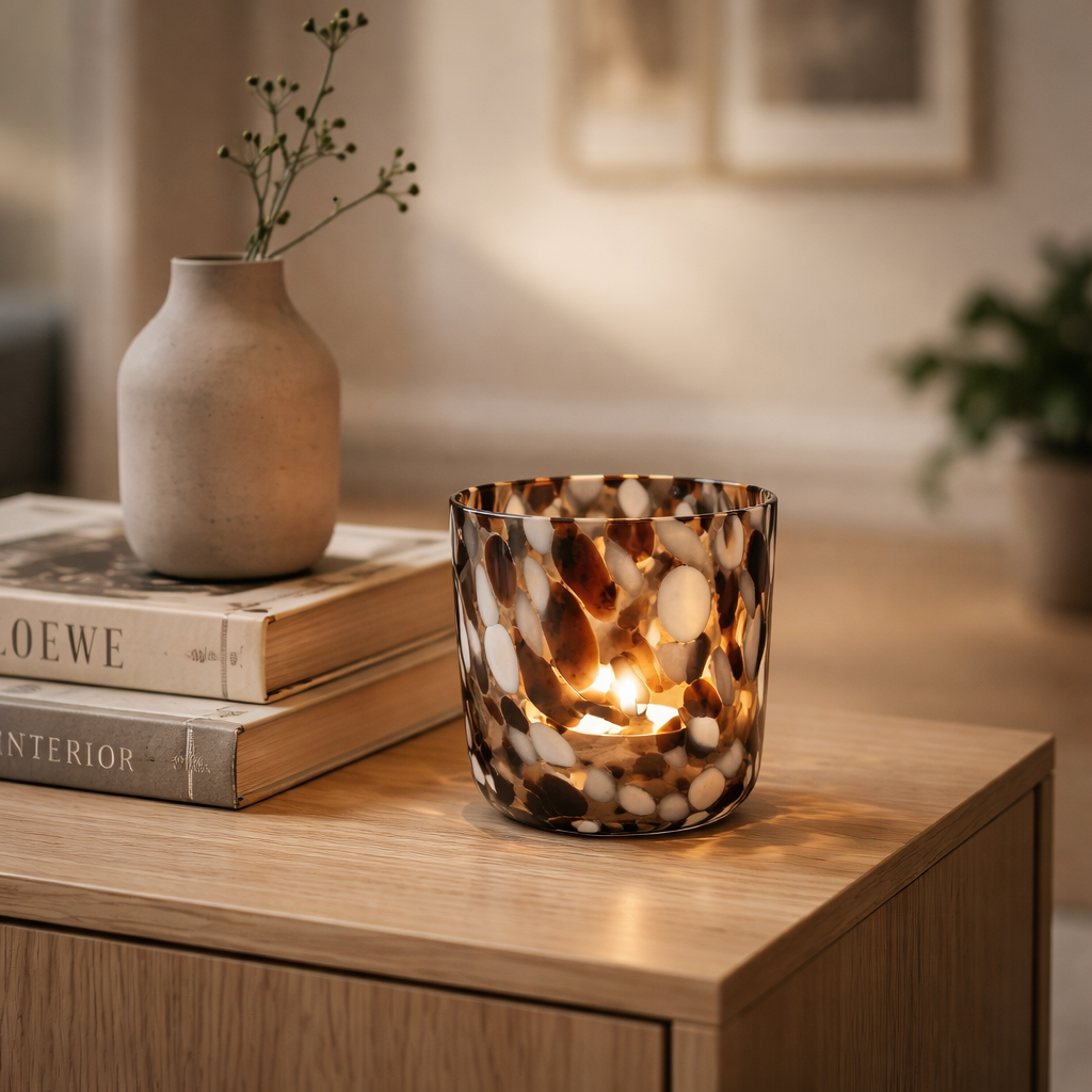 Charmig ljuslykta i mönstrat glas. Ger ett mycket vackert sken.