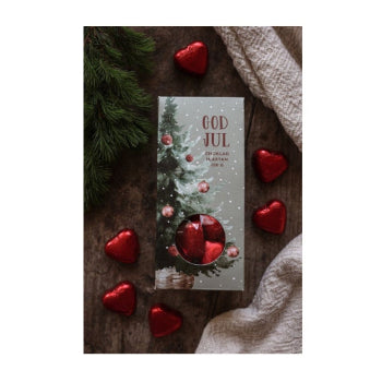 Söta chokladhjärtan inslagna i vackert rött folie. Kommer i en vacker dekorativ ask med text: "God Jul". Perfekt gåva att ha med sig när man är bortbjuden till julens festligheter.