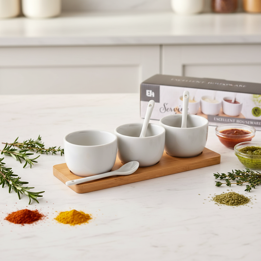 Snyggt och praktiskt set i 7 delar. Innehåller träbricka, tre skålar i vacker vit keramik och tre skedar. Perfekt för att servera olika såser, dressingar eller snacks.